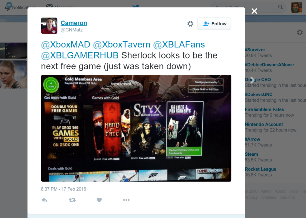 According to one of our community members on Twitter, Sherlock Holmes: Crimes & Punishments might be part of the March Games with Gold lineup. Below is a screenshot of the tweet we were mentioned in.